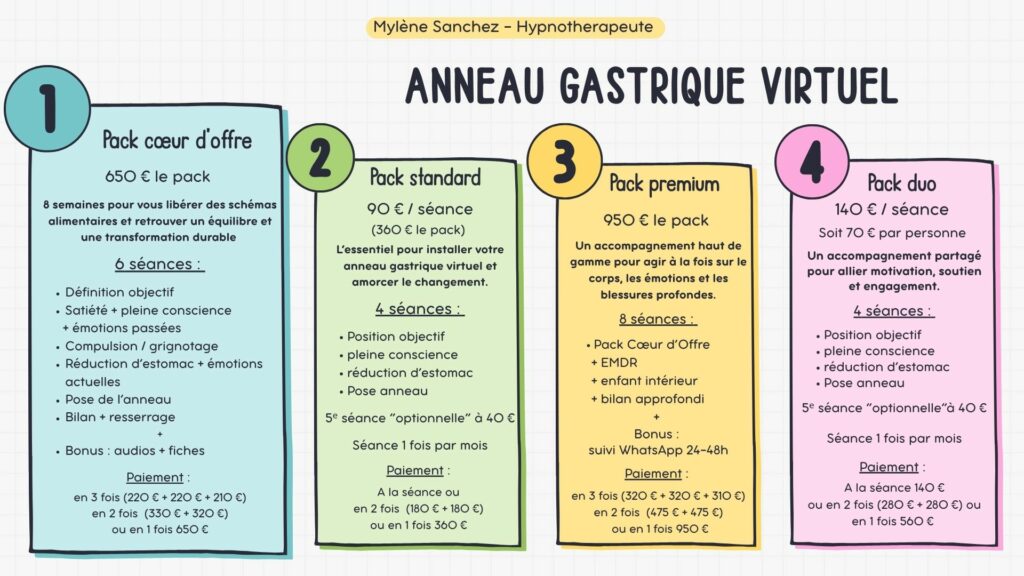 L’anneau gastrique virtuel se pose en 4, 6 ou 8 séances, je propose plusieurs packs afin de répondre aux attentes et besoins de chacun.